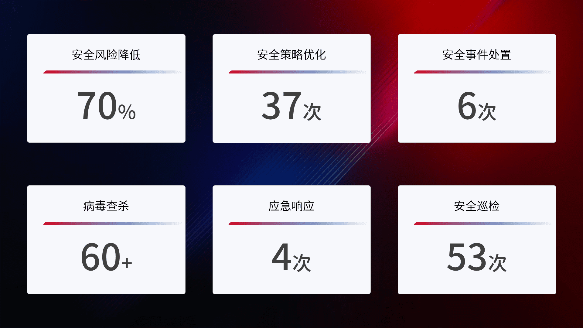 提供全面的安全事件报告体系,,,,包括处置报告、、周报、、、季度和年度总结,,,,结合持续监控,,,帮助客户深入了解网络安全状况。。